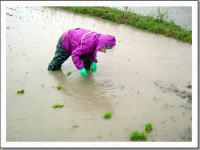![]() 雑草を取ったり、田んぼの水を調節したり、 病気が出たり、虫がつかないように、稲を育てます。 3月〜5月に、