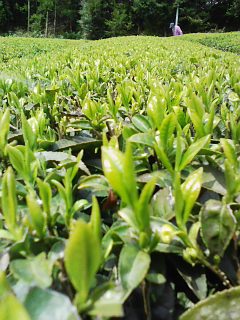 ![]() 山あいの冷たい風の当たりにくい茶畑。 南向きなので、成長も早いです。 |