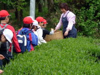 茶畑に到着! 小学校から徒歩20分…。 元気に歩いて来られました。 摘み頃の新芽を見ながら、 お茶の事を詳しく知っていきましょう!